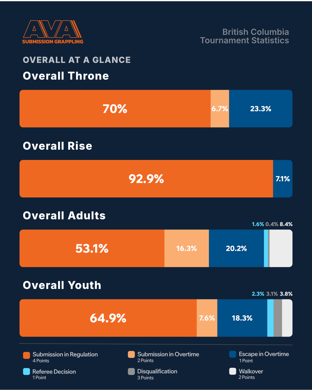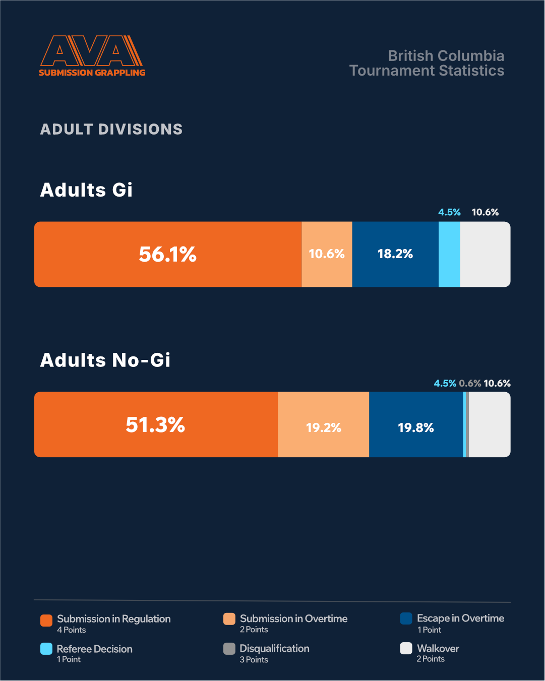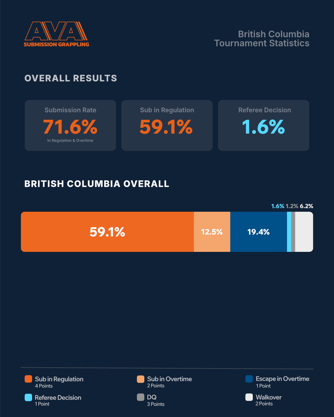 British Columbia came in strong as AVA’s second tournament of the 2026 season, with more than 7 out of every 10 matches ending by submission across regulation and overtime, totaling 71.6%. No-Gi youth led the way at 72.7% in regulation, followed by Gi youth at 59.2%. On the adult side, Gi came in at 56.1% and No-Gi at 51.3%.