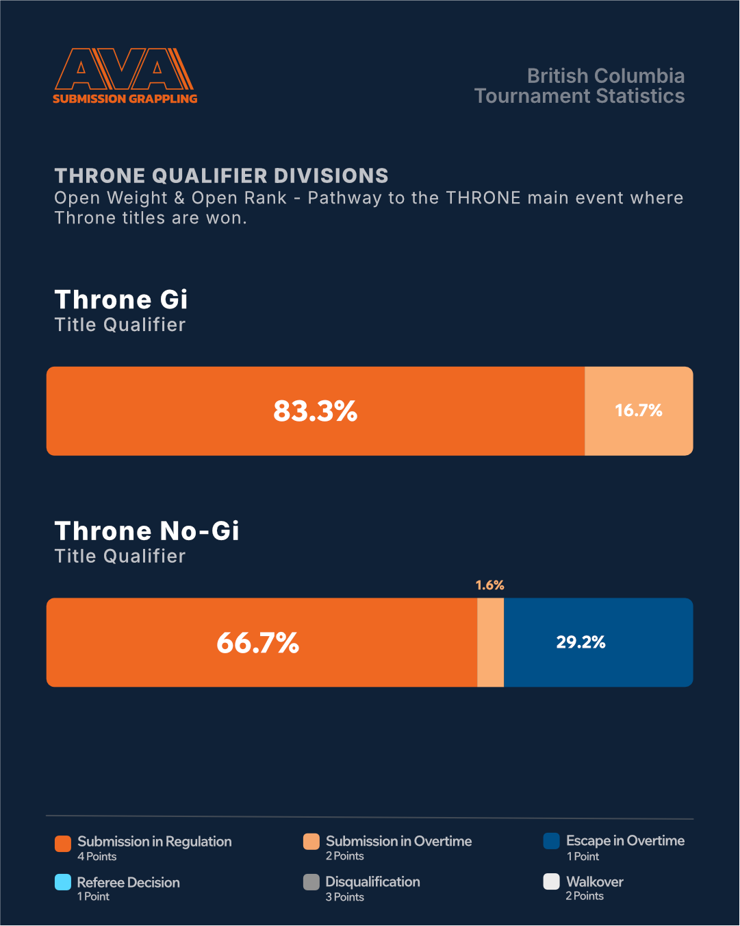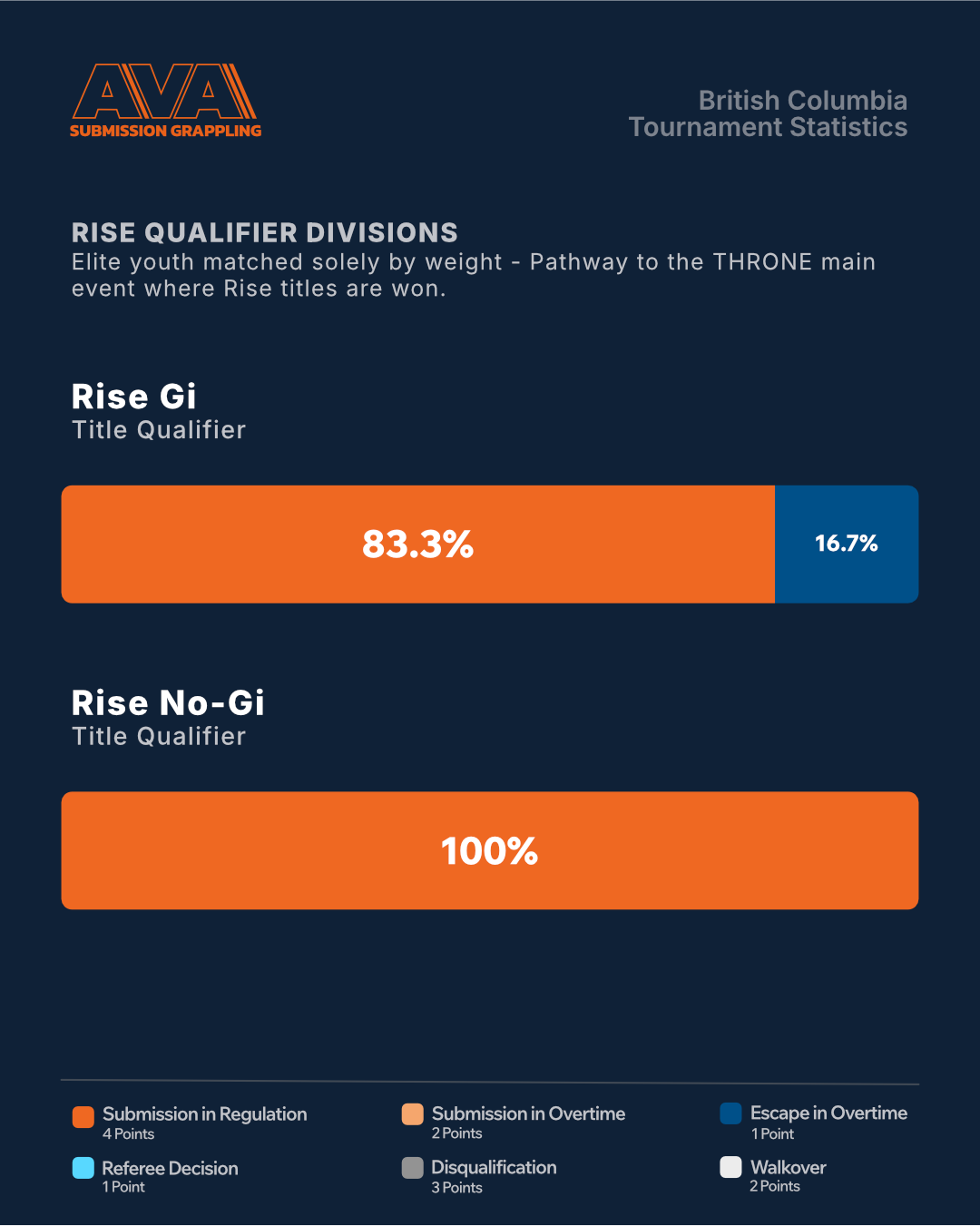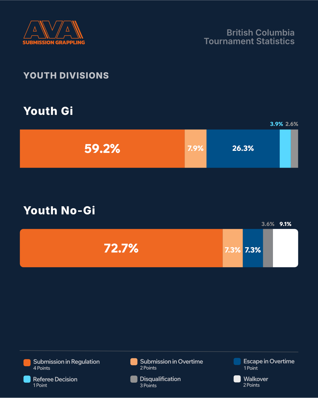British Columbia came in strong as AVA’s second tournament of the 2026 season, with more than 7 out of every 10 matches ending by submission across regulation and overtime, totaling 71.6%. No-Gi youth led the way at 72.7% in regulation, followed by Gi youth at 59.2%. On the adult side, Gi came in at 56.1% and No-Gi at 51.3%.