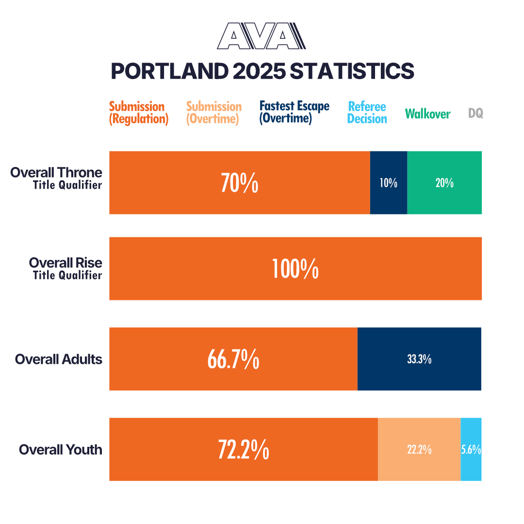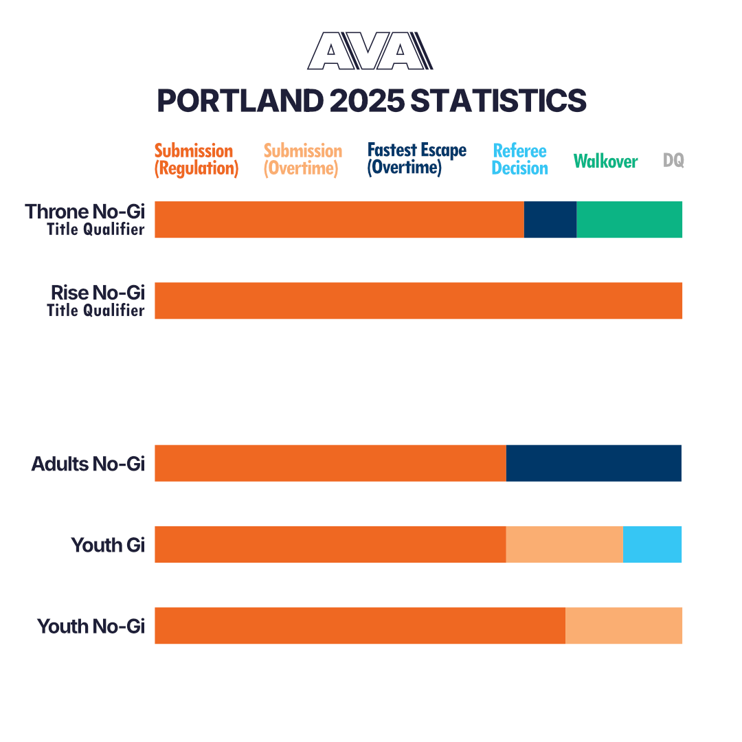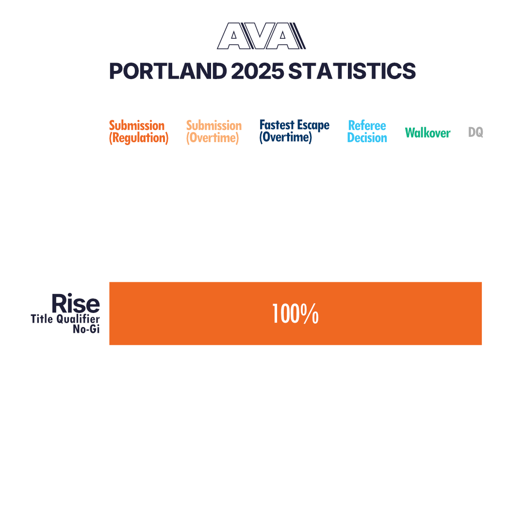 The Rise: Elite Youth No-Gi division had the highest submission in regulation at 100%, followed by the Youth No-Gi at 77.8%, and lastly the Throne No-Gi Title Qualifiers at 70%.