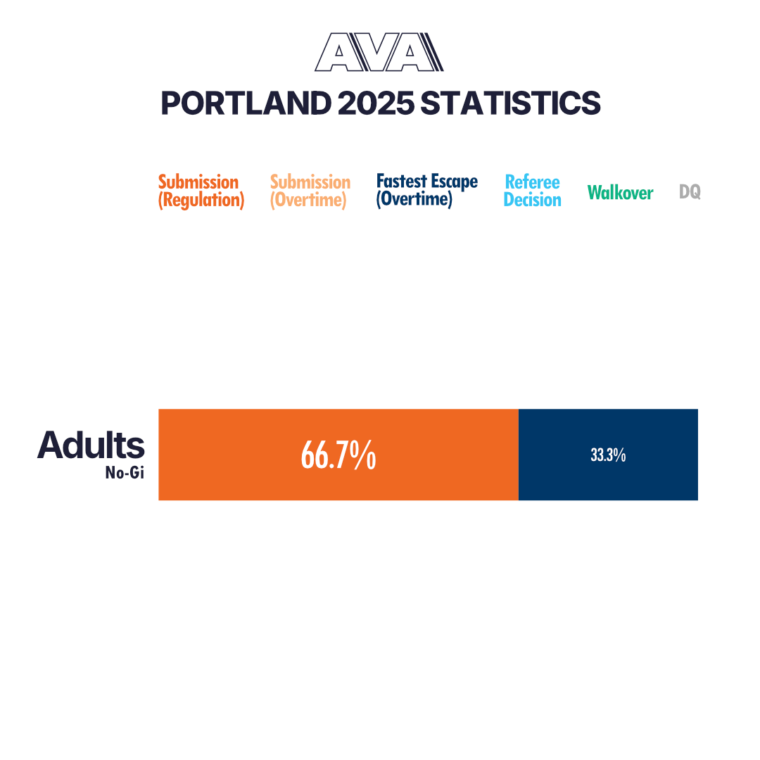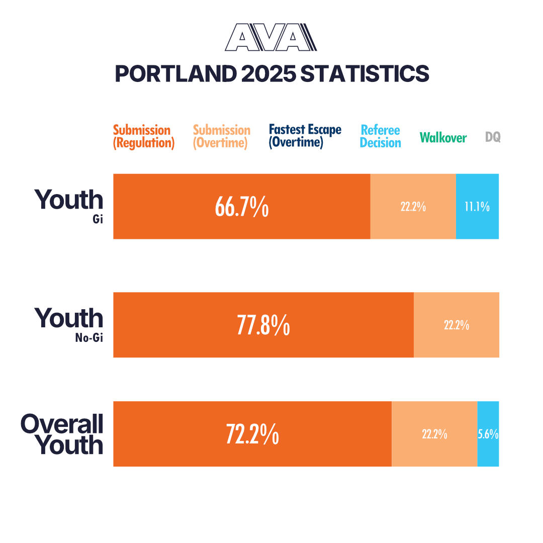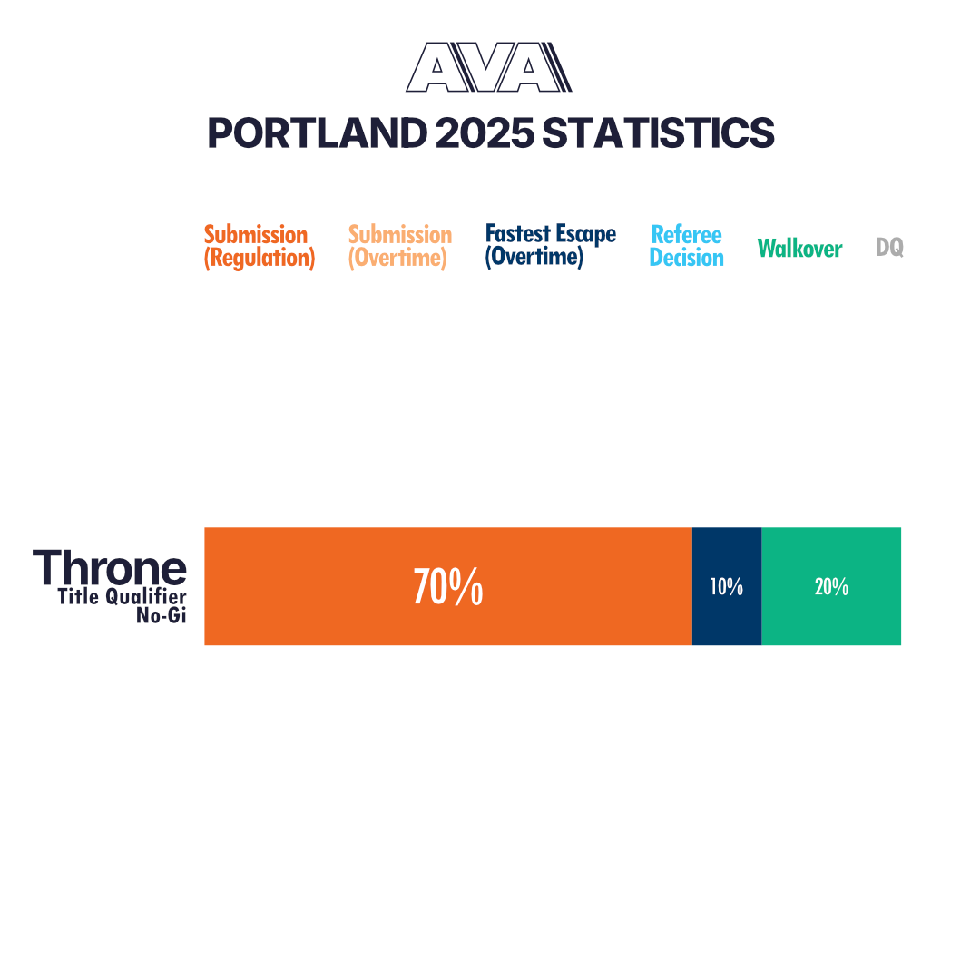 The Rise: Elite Youth No-Gi division had the highest submission in regulation at 100%, followed by the Youth No-Gi at 77.8%, and lastly the Throne No-Gi Title Qualifiers at 70%.